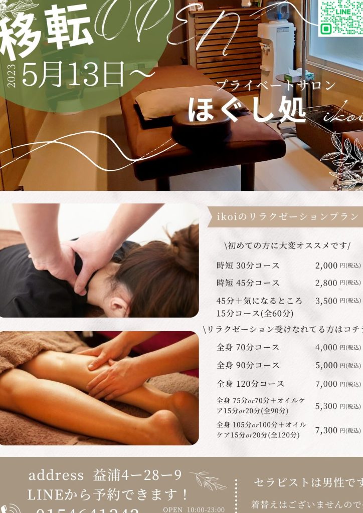 公式LINEページ(https://lin.ee/J1AZrDh)では、最新の情報やお得なクーポンなども提供しています。ぜひ一度、ほぐし処 ikoiで心身ともにリフレッシュしてみてください。★★★★★